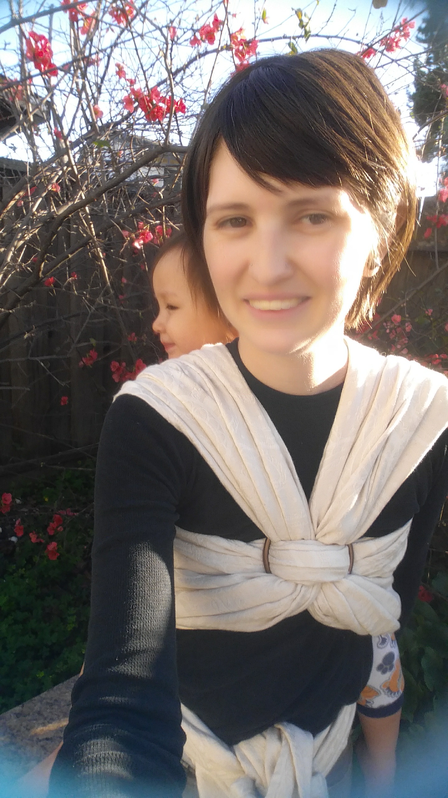 Ruck back carry with a toddler, finished with a Sling Ring. I am using a Size 4 Navy Stripes *secret tester* and a Large Sling Ring.