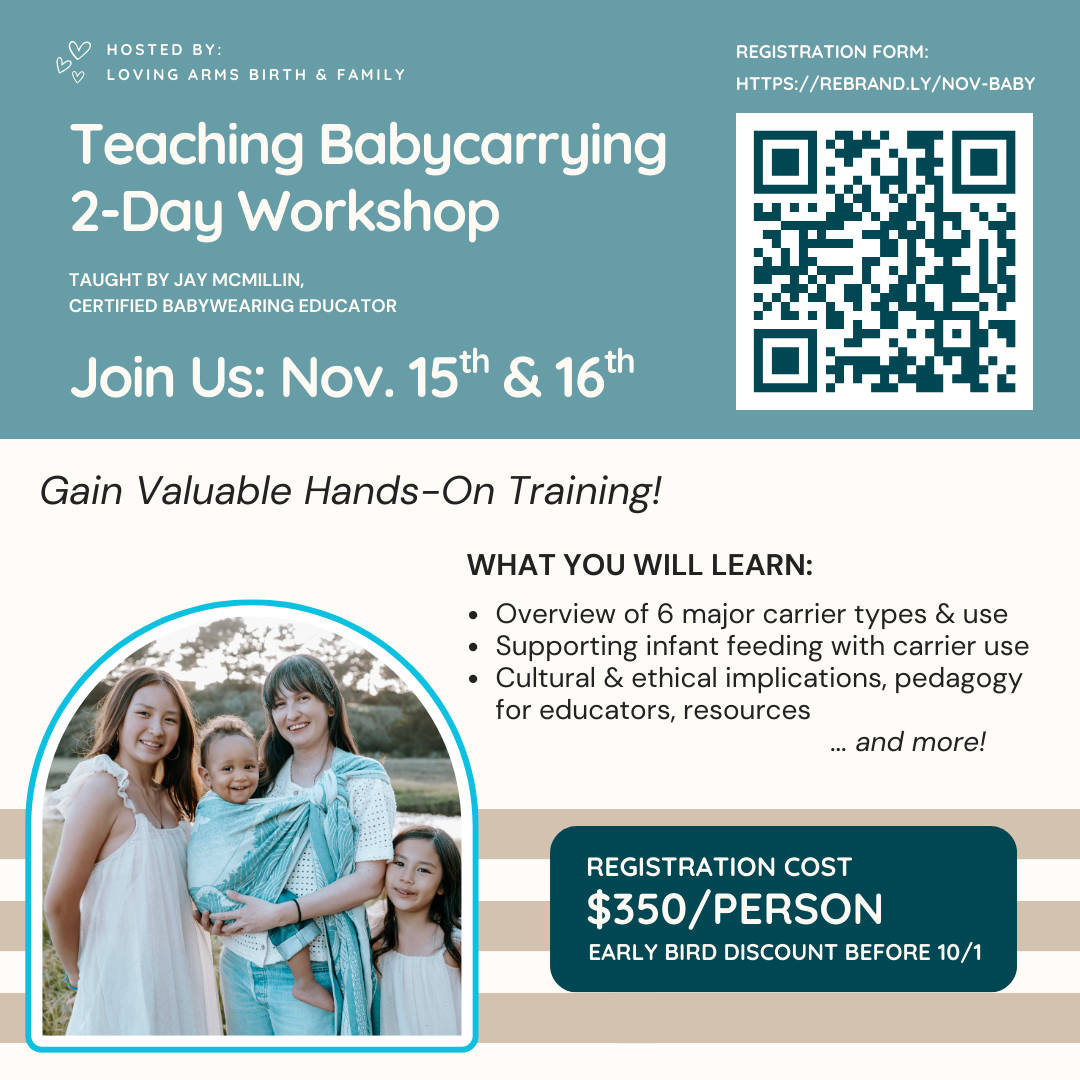 This 2-day workshop is intended for those who are working as Prenatal and Postpartum educators. It is aimed at improving your skill set with woven wraps, and increasing your ability to teach wrapping through better understanding of wrap mechanics, and demystifying wrapping terminology. We will cover a series of front, hip, and back carries with both a short and long wrap – leading up to fancy finishes at the end of the second day. You will leave feeling confident in your wrapping skills, and your ability to teach wrapping. No prior woven wrap experience is necessary.